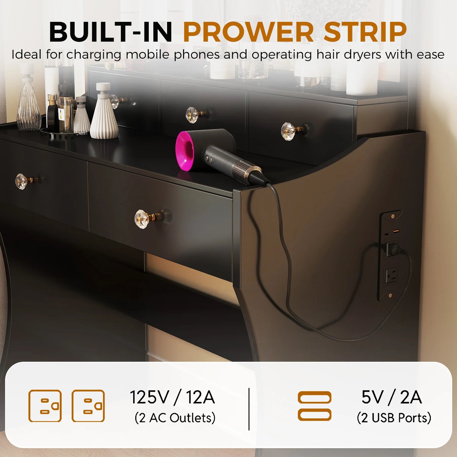 - Built-in charging station: Includes 2 standard outlets and 2 USB ports, so you can charge phones, hair tools, or speakers while you sit at the vanity.