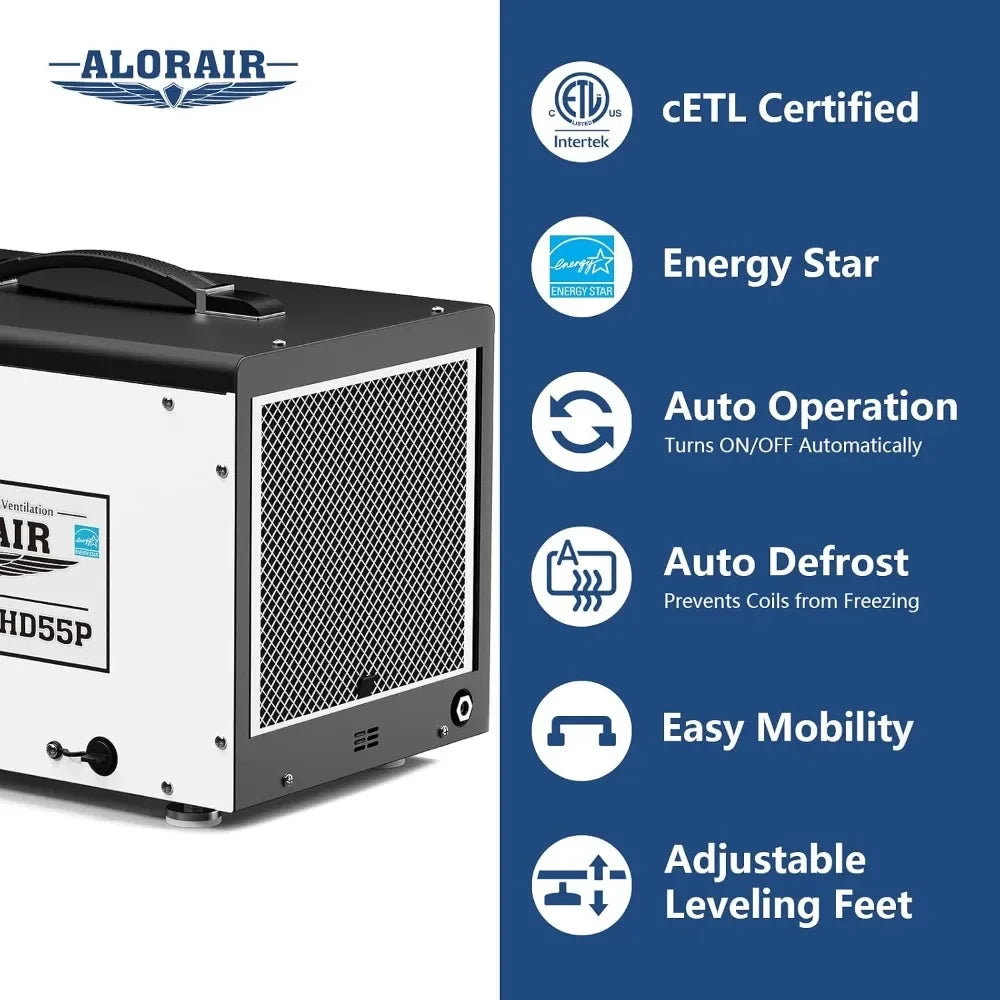 - 55 pints per day (AHAM) up to 1,500 sq ft, making it ideal for basements, crawl spaces, garages, and large rooms, and it gives you steady, controlled humidity with Energy Star efficiency.